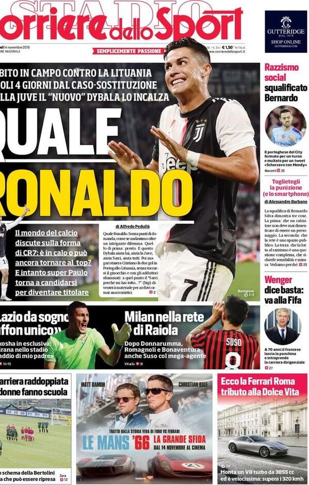 Milan sui media, le prime pagine dei giornali di oggi (14/11/2019)