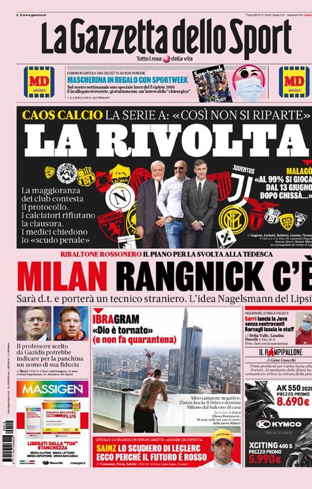 NEWS MILAN - Ecco le prime pagine di oggi, venerdì 15 maggio 2020 de 'La Gazzetta dello Sport', 'Corriere dello Sport' e 'Tuttosport'. In primo piano la Serie A con diversi club che non sono d'accordo con il protocollo di sicurezza emanato dal Governo. I calciatori rifiutano la clausura e i medici delle squadre chiedono lo "scudo penale". In casa Milan, invece, si parla sempre di Ralf Rangnick: deciso il suo ruolo in rossonero che sarà il Dt al posto di Paolo Maldini.