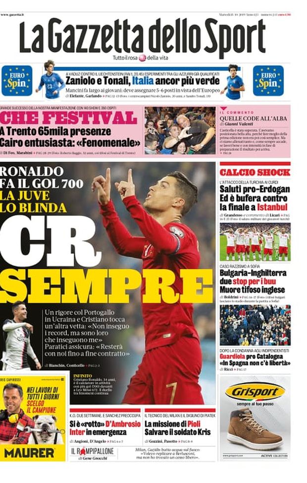 Ecco le prime pagine di oggi, martedì 15 ottobre 2019 de 'La Gazzetta dello Sport', 'Corriere dello Sport' e 'Tuttosport'. In primo piano i 700 gol raggiunti da Cristiano Ronaldo in carriera dopo la rete realizzata nella serata di ieri contro l'Ucraina. Nel taglio basso spazio a Piatek: Stefano Pioli vuole rigenerarlo. A tra poco per la rassegna stampa completa, ovviamente in chiave rossonera