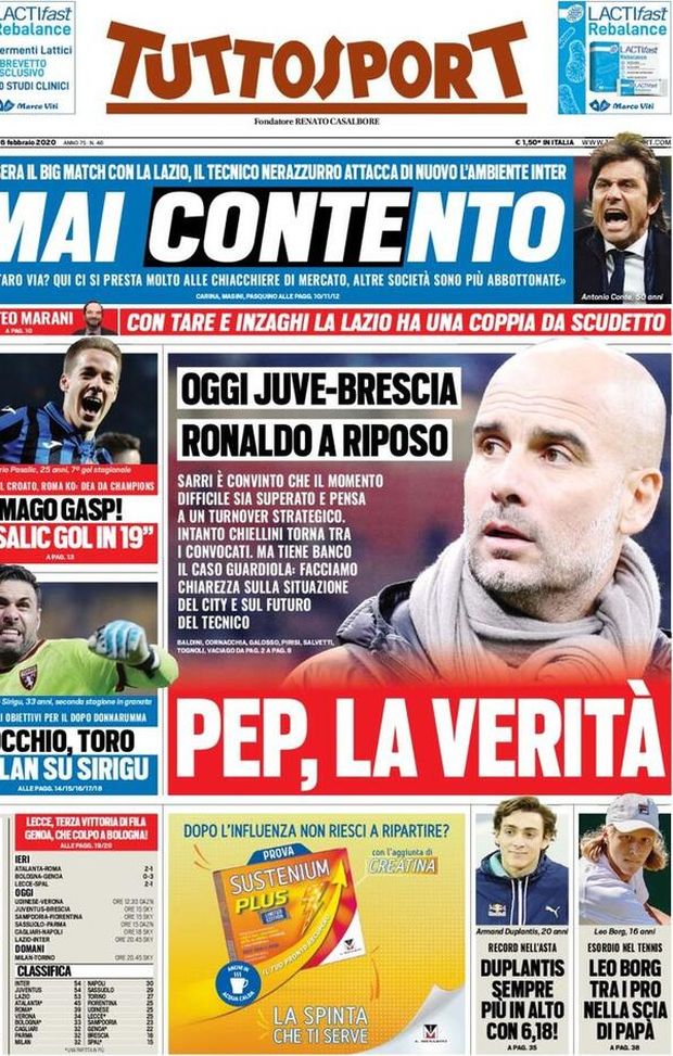Milan sui media, le prime pagine dei giornali di oggi (16/02/2020)