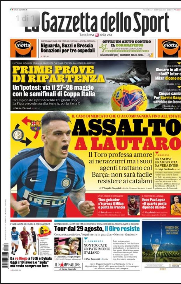 Ecco le prime pagine di oggi, giovedì 16 aprile 2020 de 'La Gazzetta dello Sport', 'Corriere dello Sport' e 'Tuttosport'. In primo piano la possibile cessione di Lautaro Martinez al Barcellona: l'attacca professa amore ai nerazzurri, ma non sarà facile resistere. Sul fronte Milan, invece, spazio a Theo Hernandez, una delle note positive della stagione rossonera.