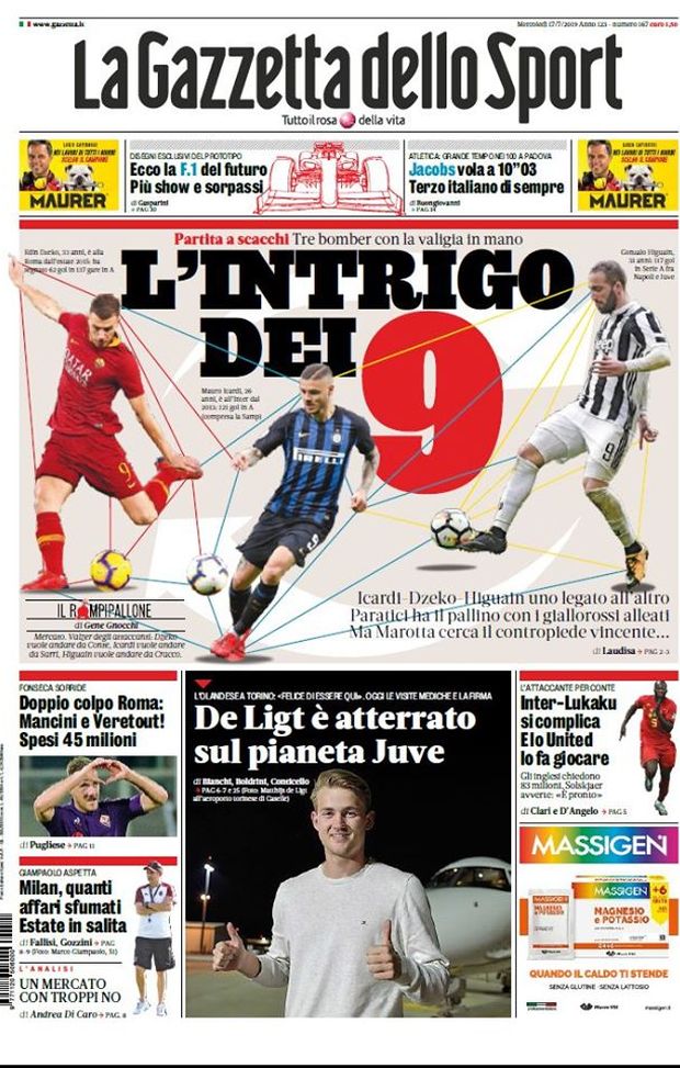 Ecco le prime pagine di oggi mercoledì 17 luglio 2019 de 'La Gazzetta dello Sport', 'Corriere dello Sport' e 'Tuttosport'. In primo piano il calciomercato, con tre bomber con la valigia in mano: Dzeko, Icardi e Higuain. La Roma è ormai a un passo da Mancini e da Veretout, seguito dal Milan. A tra poco per scoprire tutta la rassegna, ovviamente in chiave rossonera.