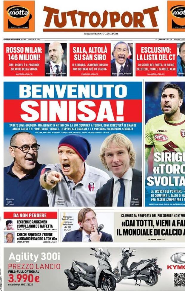 Milan sui media, le prime pagine dei giornali di oggi (17/10/2019)