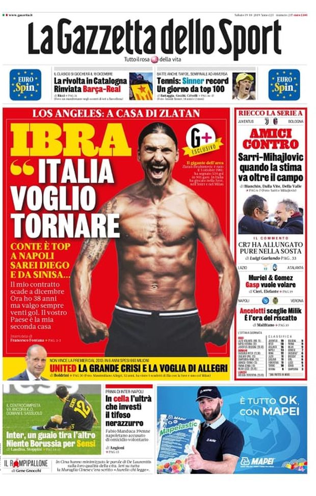 Ecco le prime pagine di oggi, sabato 19 ottobre 2019 de 'La Gazzetta dello Sport', 'Corriere dello Sport' e 'Tuttosport'. In primo piano le parole di Zlatan Ibrahimovic, che da Los Angeles ha svelato di voler tornare in Italia: le big della Serie A sono alla finestra. A tra poco per la rassegna stampa completa, ovviamente in chiave rossonera.