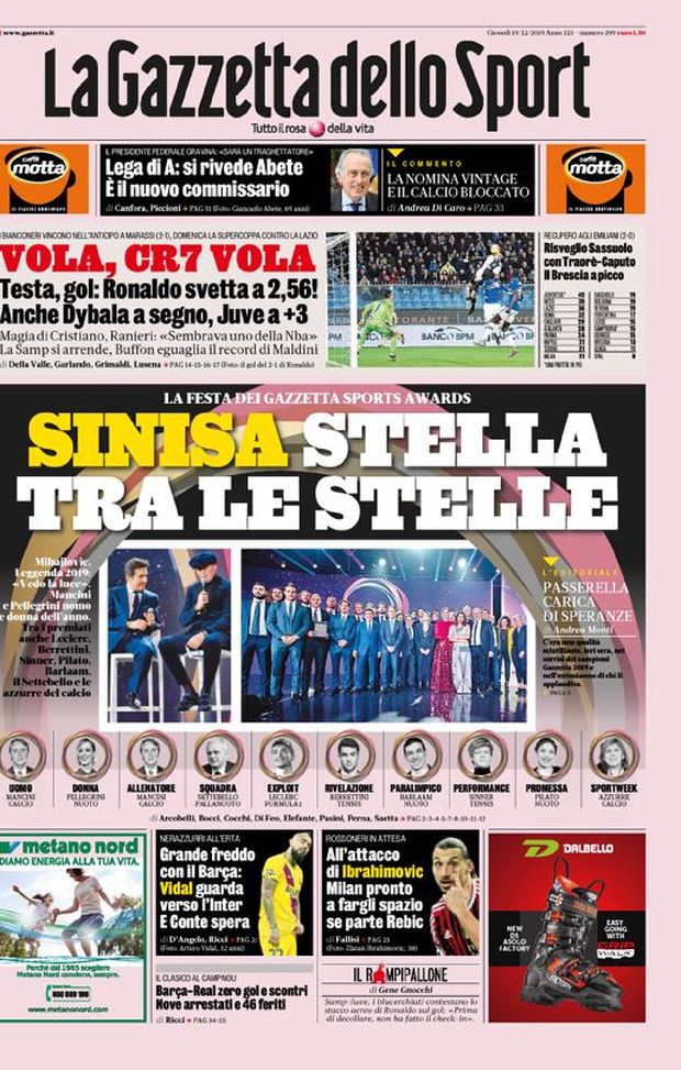 Ecco le prime pagine di oggi, giovedì 19 dicembre 2019 de 'La Gazzetta dello Sport', 'Corriere dello Sport' e 'Tuttosport'. In primo piano i Gazzetta Sports Awards, con Sinisa Mihajlovic, allenatore del Bologna, grande protagonista. Nel taglio basso spazio ancora una volta a Zlatan Ibrahimovic: il Milan è in attesa, ma intanto Ante Rebic è pronto a lasciare il club rossonero. A tra poco per la rassegna stampa completa.