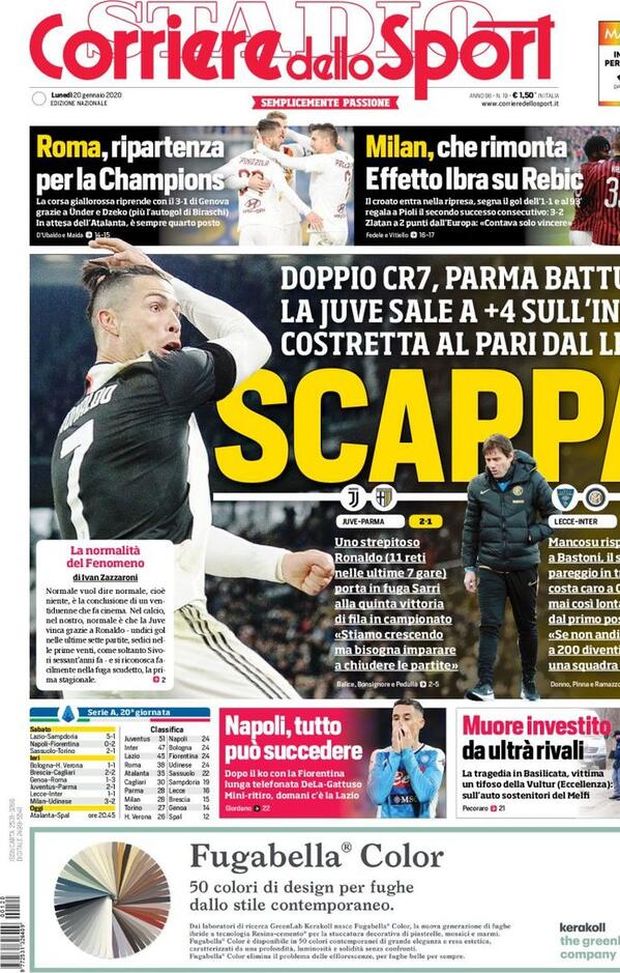 "NEWS MILAN - Anche il 'Corriere dello Sport', naturalmente, incentra sul duello per lo Scudetto tra Juventus e Inter la propria prima pagina. Cristiano Ronaldo, 11 gol nelle ultime 7 gare, è devastante: i bianconeri battono anche il Parma e volano a +4 sull'Inter, a cui non è bastata la rete di Alessandro Bastoni per vincere al 'Via del Mare' contro il coriaceo Lecce di Fabio Liverani. In alto, sotto la testata, spazio alle belle vittorie di Roma, 3-1 a 'Marassi' contro il Genoa, e Milan, 3-2 in casa sull'Udinese con gol, al 93', di Ante Rebic. Nel taglio basso, il quotidiano romano parla anche del Napoli: Gennaro Gattuso sarebbe già a rischio esonero dopo l'ennesima sconfitta.