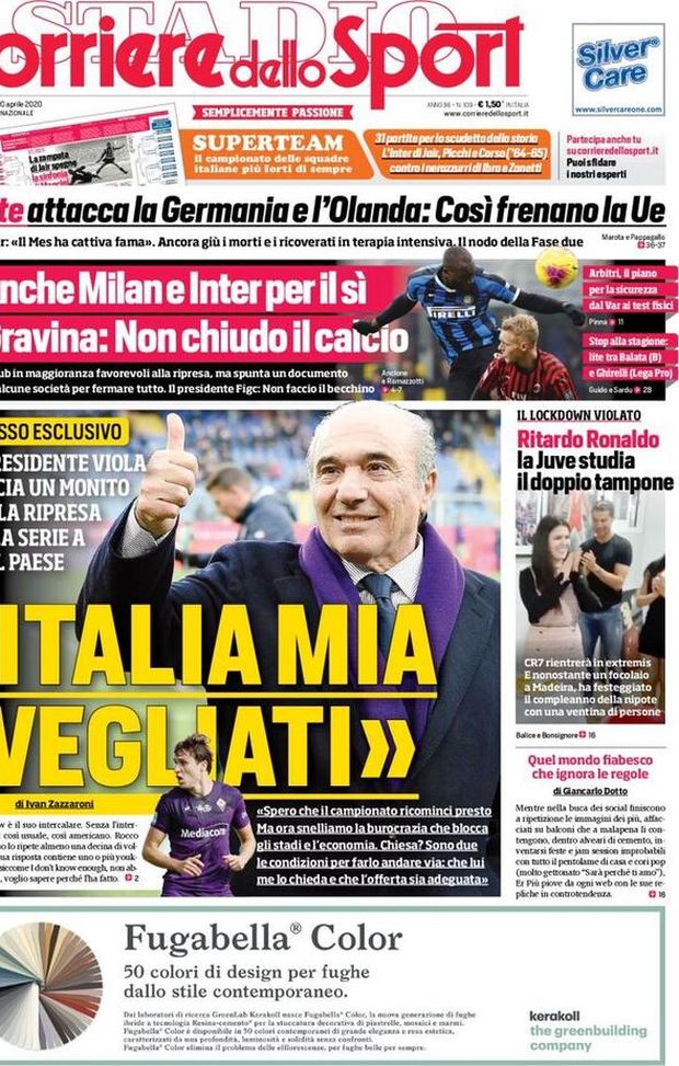 "NEWS MILAN - Il 'Corriere dello Sport', in prima pagina, apre con un'intervista esclusiva a Rocco Commisso, Presidente della Fiorentina, che parla sia di un'eventuale ripresa del campionato di Serie A, sia di calciomercato e, in particolare, del futuro del suo gioiello, Federico Chiesa. In alto, sotto la testata, il 'sì' di Milan e Inter alla ripresa del torneo e le parole di Gabriele Gravina, Presidente della FIGC, preoccupato dalle perdite del mondo del calcio nel caso in cui la stagione dovesse definitivamente saltare. Nel riquadro verticale, un richiamo su Cristiano Ronaldo, stella della Juventus, che ha violato la quarantena a Madeira (Portogallo) per festeggiare il compleanno della nipote ...