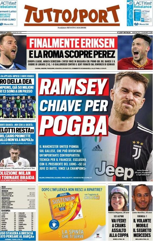 "NEWS MILAN - Infine, 'Tuttosport', il quale, invece, in apertura parla di calciomercato: il Manchester United vorrebbe riportare in Premier League il centrocampista gallese Aaron Ramsey. Ecco, allora, che l'ex Arsenal potrebbe diventare una pedina di scambio nella trattativa per il ritorno di Paul Pogba in bianconero. In alto, sotto la testata, si celebrano Christian Eriksen e Carles Pérez, eroi di Inter e Roma in Europa League, mentre, nel riquadro verticale, si parla dell'Atalanta, molto vicina a guadagnare altri 13 milioni di euro per l'accesso ai quarti di Champions League, di Andrea Belotti, centravanti del Torino nel mirino del Napoli ma 'stoppato' in granata dal Presidente Urbano Cairo e, infine, del Milan, che potrebbe riportare in società l'ex direttore sportivo Ariedo Braida.
