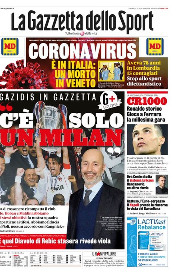 Ecco le prime pagine di oggi, sabato 22 febbraio 2020 de 'La Gazzetta dello Sport', 'Corriere dello Sport' e 'Tuttosport'. In primo piano l'intervista a Ivan Gazidis, amministratore delegato del Milan, che, ospite della "Gazzetta dello Sport", ha smentito le voci su Rangnick, accostato sempre con maggiore insistenza alla panchina rossonera. A tra poco per scoprire tutta la rassegna stampa.