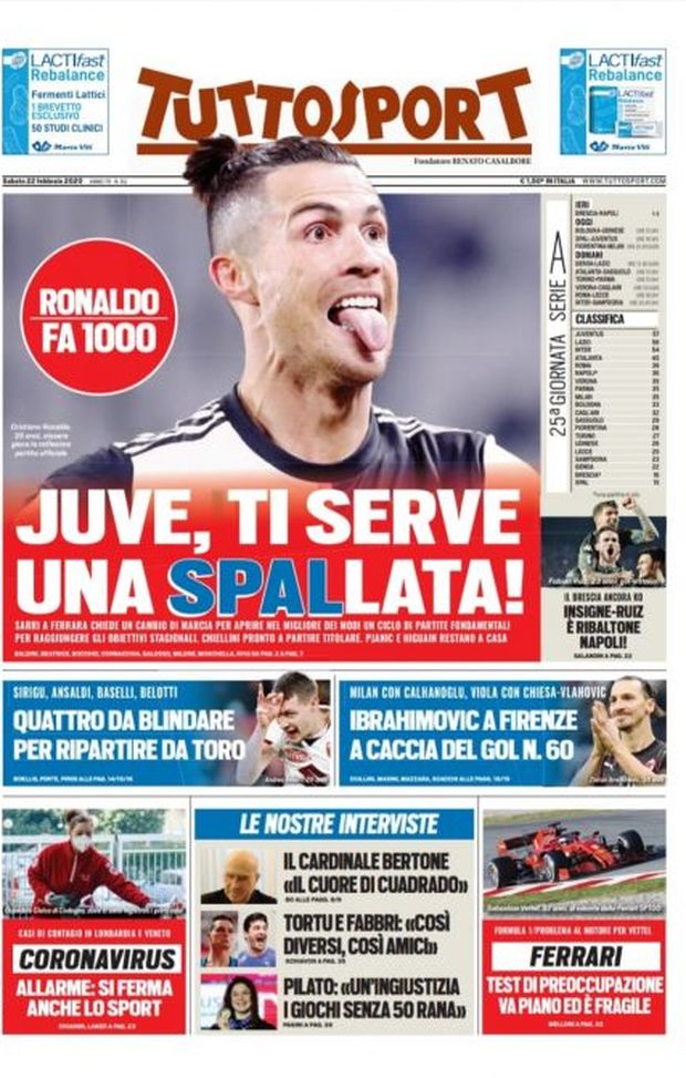 Milan sui media, le prime pagine dei giornali di oggi (22/02/2020)
