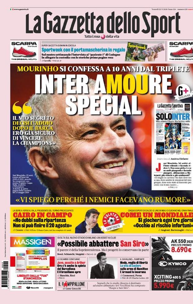 MILAN NEWS - Ecco le prime pagine di oggi, venerdì 22 maggio 2020 de 'La Gazzetta dello Sport', 'Corriere dello Sport' e 'Tuttosport'. In primo piano le parole di José Mourinho in esclusiva alla Gazzetta. Urbano Cairo, presidente del Torino, contrario alla ripartenza del campionato, mentre per la sovraintendenza lo stadio San Siro potrà essere tranquillamente demolito perché non ha valore culturale.