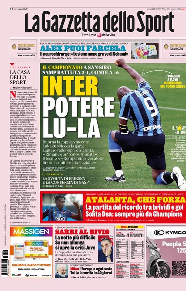 MILAN NEWS - Ecco le prime pagine di oggi, lunedì 22 giugno 2020 de 'La Gazzetta dello Sport', 'Corriere dello Sport' e 'Tuttosport'. In primo piano i risultati delle partite di ieri, con l'Inter che ha avuto la meglio sulla Sampdoria per 2-1 grazie alla solita coppia del gol Lukaku-Martinez, mentre l'Atalanta continua a macinare gol vincendo 4-1 contro il Sassuolo: Zapata protagonista con una doppietta. Inoltre viene riportato il confronto tecnico tra Sarri e Ronaldo sul ruolo del portoghese.