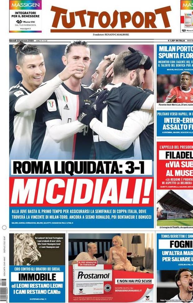 Milan sui media, le prime pagine dei giornali di oggi (23/01/2020)
