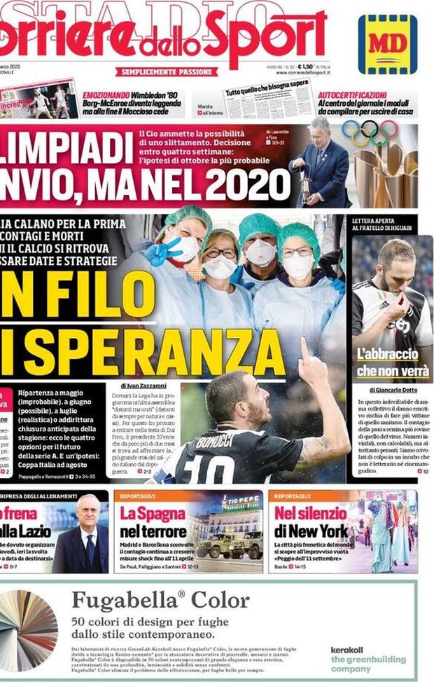 "NEWS MILAN - Sul 'Corriere dello Sport', invece, la copertina è dedicata ai numeri del coronavirus che, ieri, sono stati in discesa rispetto a quelli, inquietanti, di sabato. Un filo di speranza per la popolazione italiana e mondiale: il calcio, dunque, si interroga su quando poter ripartire. Sul tavolo ci sono 4 ipotesi, con la possibilità di disputare le partite che restano di Coppa Italia ad agosto. Sotto la testata, intanto, si parla dell'eventualità di rinviare le Olimpiadi di Tokyo 2020 di 4 settimane, posticipandole dunque a novembre, mentre, in basso, oltre ai reportage da Spagna (Madrid e Barcellona) e dagli Stati Uniti d'America (New York) sull'emergenza CoVid_19, ecco la frenata di Claudio Lotito, Presidente della Lazio, sulla ripresa degli allenamenti della sua squadra.