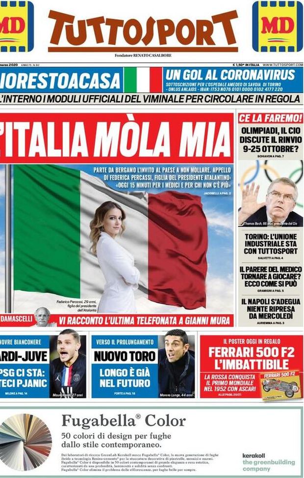 "NEWS MILAN - Infine, ecco 'Tuttosport', che, in copertina, inserisce l'appello di Federica Percassi, figlia del Presidente dell'Atalanta, a non mollare mai nella lotta contro il coronavirus ed a ricordare oggi, per 15', chi è scomparso a causa del CoVid_19 oltre a far sentire la propria solidarietà a tutti i medici impegnati nel debellare questa pandemia. Mentre il Comitato Olimpico Internazionale (CIO) decide sul rinvio delle Olimpiadi di Tokyo 2020 (qui si parla di uno slittamento al 9-25 ottobre ...), in basso si parla di calciomercato: la Juventus vorrebbe Mauro Icardi, con il PSG pronto a chiedere in cambio Miralem Pjanic, mentre il Torino già pensa di prolungare il proprio contratto al giovane tecnico Moreno Longo.