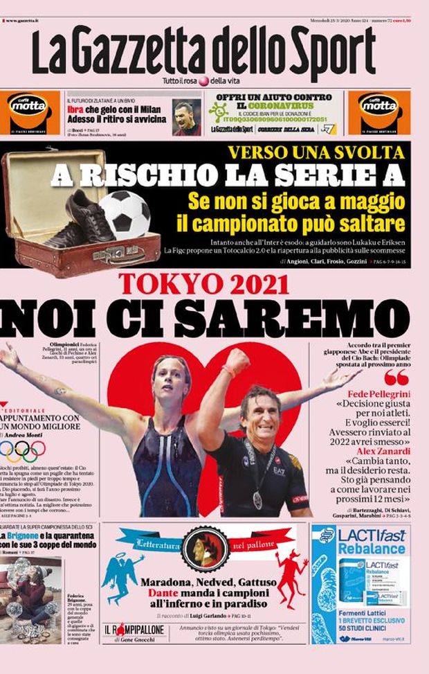 Ecco le prime pagine di oggi,mercoledì 25 marzo 2020 de 'La Gazzetta dello Sport', 'Corriere dello Sport' e 'Tuttosport'. In primo piano la Serie A, che deve provare a gestire l'emergenza coronavirus: se non si gioca a maggio il campionato rischia di saltare. Sul fronte Milan, spazio a Zlatan Ibrahimovic: lo svedese sembra essere vicino al ritiro. A tra poco per la rassegna stampa completa.