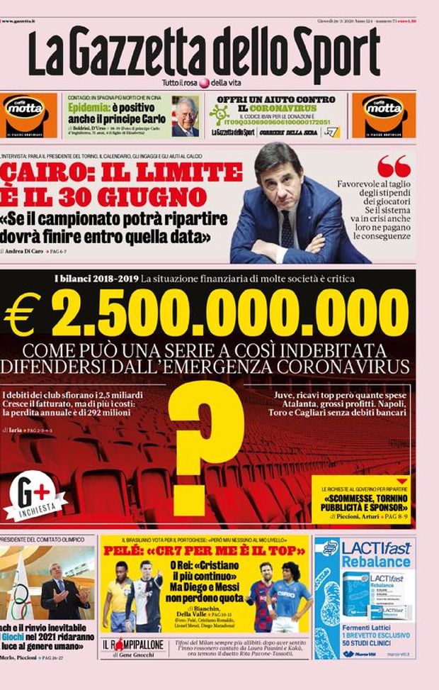 Ecco le prime pagine di oggi,giovedì 26 marzo 2020 de 'La Gazzetta dello Sport', 'Corriere dello Sport' e 'Tuttosport'. In primo piano la crisi della Serie A dovuta all'emergenza coronavirus: i debiti dei club sfiorano i 2,5 miliardi di euro. Nel taglio alto spazio ad Urbaino Cairo, presidente del Torino. A tra poco per la rassegna stampa completa.