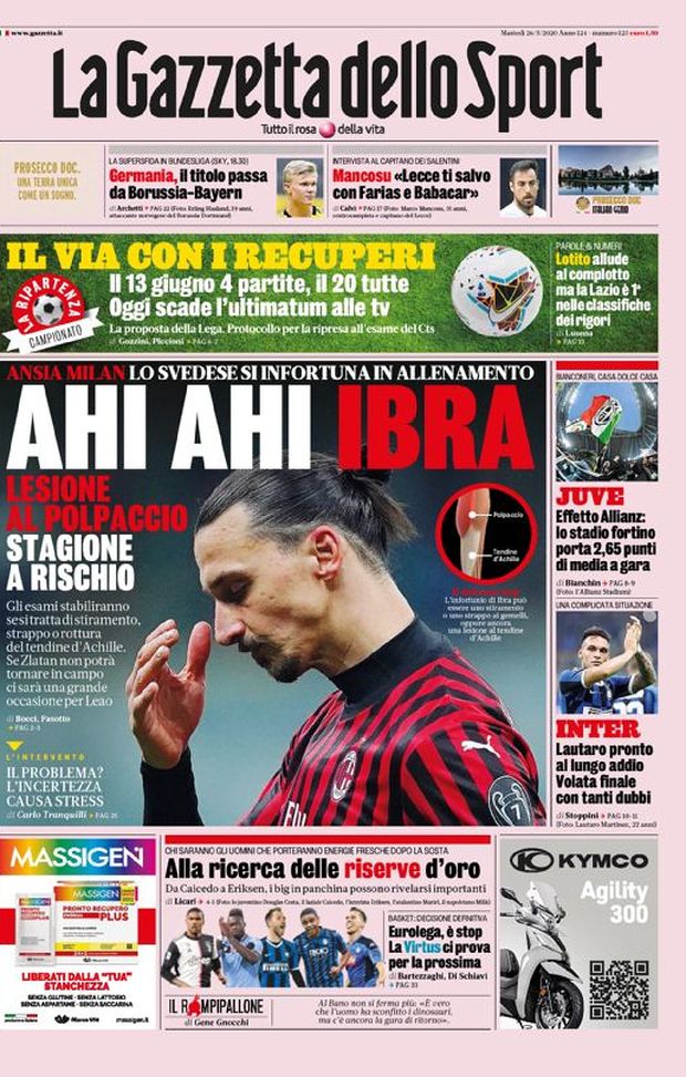 MILAN NEWS - Ecco le prime pagine di oggi, martedì 26 maggio 2020 de 'La Gazzetta dello Sport', 'Corriere dello Sport' e 'Tuttosport'. In primo piano ovviamente in casa Milan l'infortunio in allenamento di Zlatan Ibrahimovic: si capirà nelle prossime ore se si tratta di stiramento oppure di strappo o di rottura del tendine d'Achille. La stagione è a rischio.