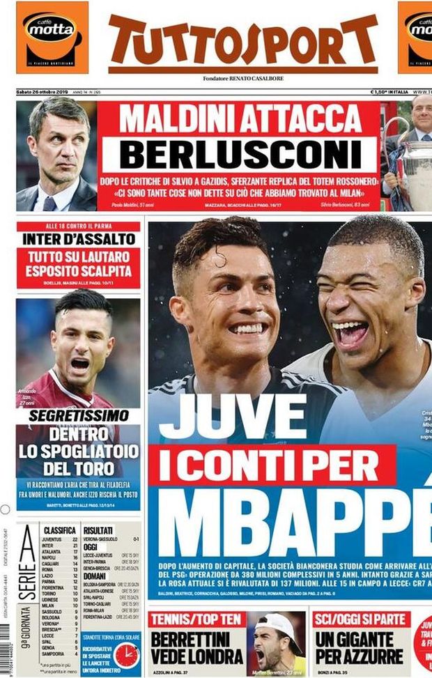 Milan sui media, le prime pagine dei giornali di oggi (26/10/2019)