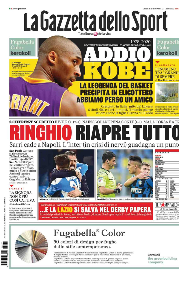 Ecco le prime pagine di oggi, lunedì 27 gennaio 2020 de 'La Gazzetta dello Sport', 'Corriere dello Sport' e 'Tuttosport'. In primo piano la tragica morte di Kobe Bryant, leggenda della NBA scomparso ieri in un incidente col suo elicottero. Cinque i morti tra i quali anche la figlia Gianna di soli 13 anni. Poi il campionato con il Napoli che batte a sorpresa la Juventus e tiene a galla l'Inter ora distante 3 punti dai bianconeri.