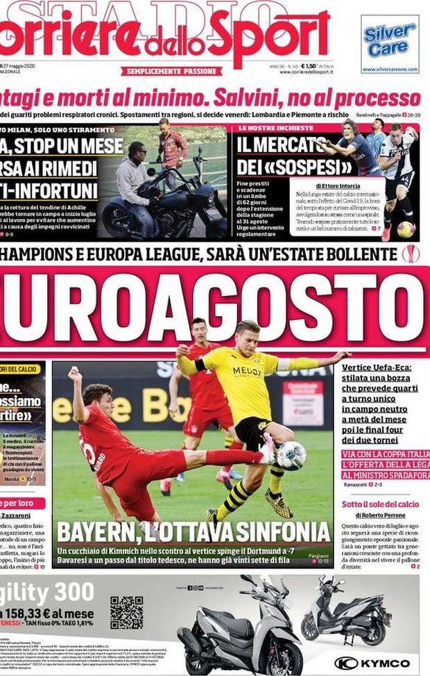 "MILAN NEWS - Il 'Corriere dello Sport', dedica la sua copertina al piano di UEFA ed ECA (Associazione Europea dei Club di calcio) in merito la conclusione di Champions League ed Europa League 2019-2020, con quarti di finale in gara unica e, successivamente, 'Final Four' per stabilire i vincitori delle competizioni internazionali. Inoltre, si dedica ampio spazio alla vittoria, 1-0, del Bayern Monaco in casa del Borussia Dortmund grazie ad un pallonetto di Joshua Kimmich sul finire del primo tempo. In alto, sotto la testata, il sospiro del sollievo del Milan, che ha sì perso Zlatan Ibrahimovic, ma soltanto fino all'inizio del mese di luglio e poi sotto con l'inchiesta del quotidiano romano sul 'mercato dei sospesi', quei calciatori che, per un motivo o per un altro, il prossimo 30 giugno non potranno cambiare squadra come previsto ...