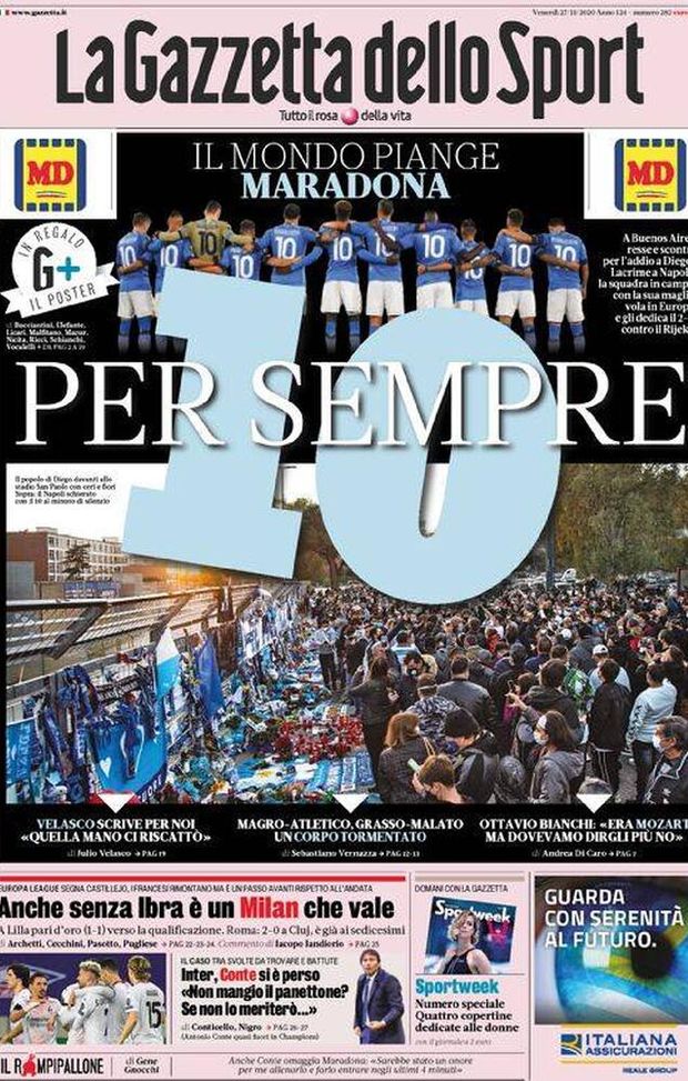 ULTIME NOTIZIE MILAN NEWS - Ecco le prime pagine di oggi, venerdì 27 novembre de 'La Gazzetta dello Sport', 'Corriere dello Sport' e 'Tuttosport'. In primo piano l'ultimo saluto a Diego Armando Maradona: ieri nella serata italiana, infatti, sono stati celebrati i funerali dell'ex calciatore argentino. Il Milan non passa a Lille: 1-1 il finale al Pierre Mauroy.