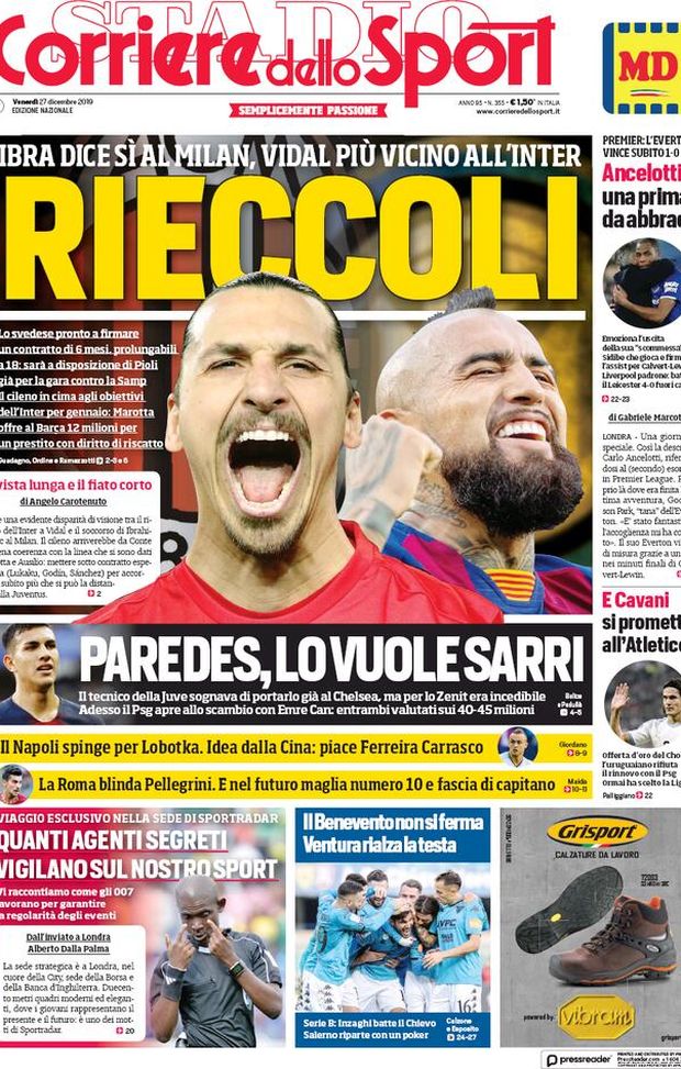 Milan sui media, le prime pagine dei giornali di oggi (27/12/2019)