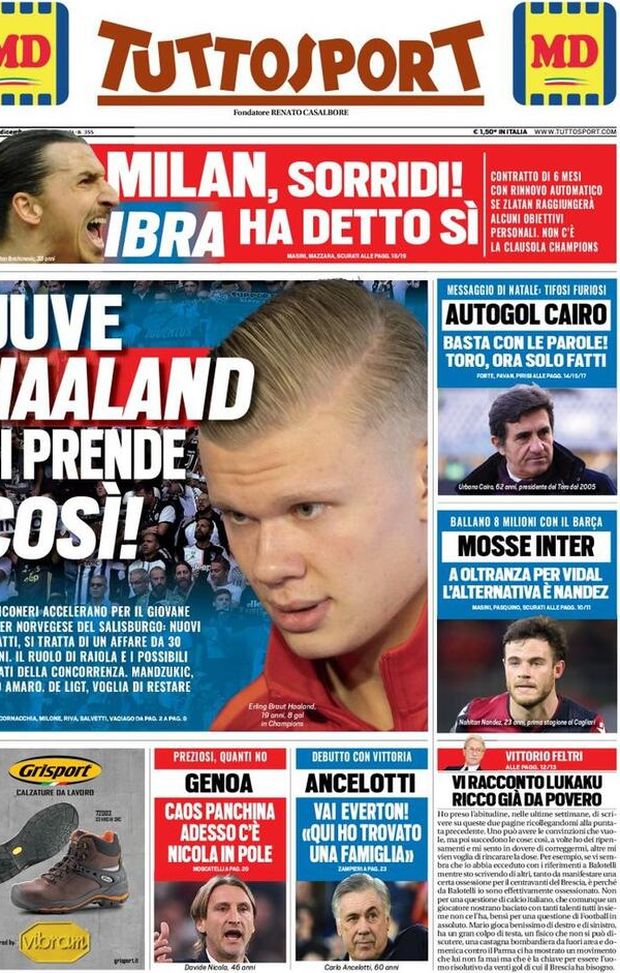 Milan sui media, le prime pagine dei giornali di oggi (27/12/2019)