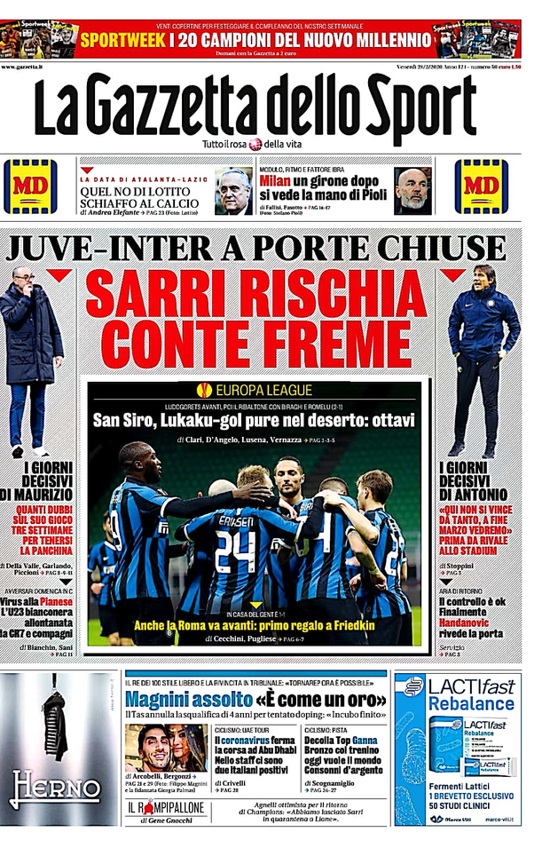 Ecco le prime pagine di oggi, venerdì 28 febbraio 2020 de 'La Gazzetta dello Sport', 'Corriere dello Sport' e 'Tuttosport'. In primo piano le gare che il prossimo turno verranno giocate ufficialmente a porte chiuse, tra cui anche Juventus-Inter e Milan-Genoa. Rossoneri impegnati domenica alle 12.30 a San Siro.