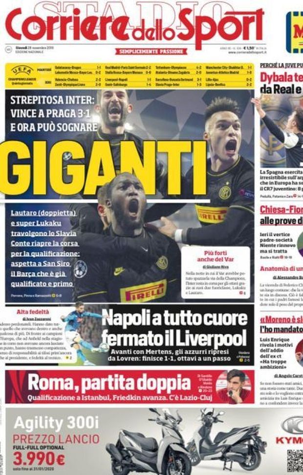 Milan sui media, le prime pagine dei giornali di oggi (28/11/2019)