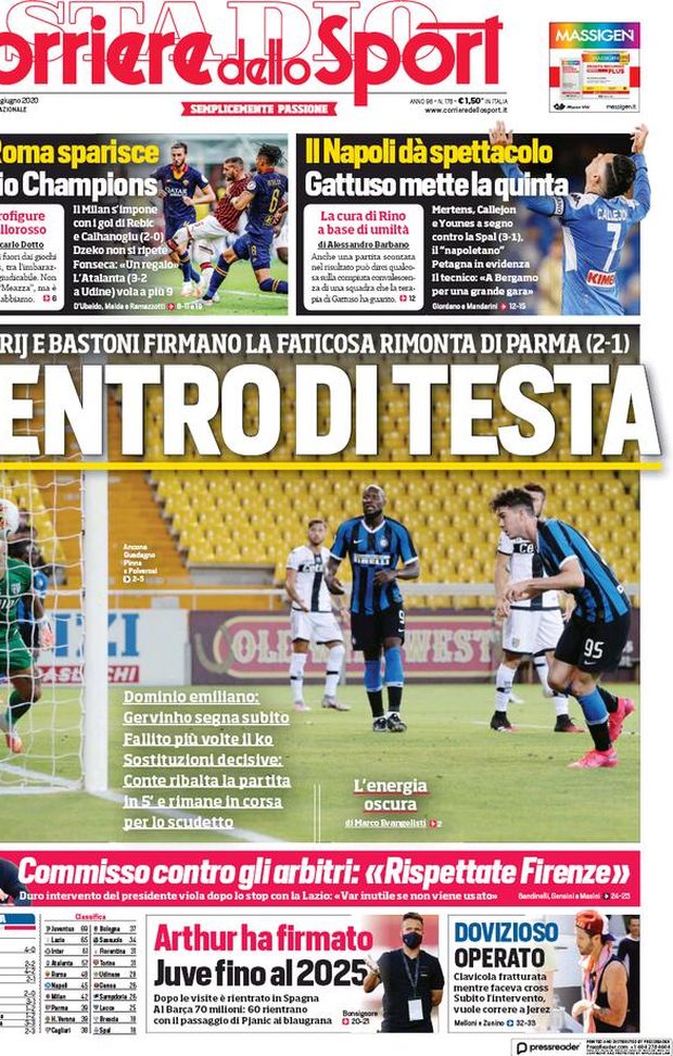 "MILAN NEWS - Anche il 'Corriere dello Sport' apre, in copertina, con l'Inter, vittoriosa nel finale di gara al 'Tardini' di Parma con i colpi di testa di Stefan de Vrij ed Alessandro Bastoni. Una gara vinta 1-2 dopo essersi fatta dominare, però, in lungo ed in largo dalla formazione di Roberto D'Aversa. In alto, sotto la testata del quotidiano romano, si analizza la sconfitta, 0-2, della Roma di Paulo Fonseca a 'San Siro' contro il Milan: le speranze di Champions League dei giallorossi, adesso, sono ridotte davvero al lumicino. Inoltre, spazio alla vittoria, l'ennesima, del Napoli di Gennaro Gattuso, che non sembra volersi più fermare: al 'San Paolo', netto 3-1 contro la Spal. Infine, in basso, lo sfogo di Rocco Commisso, Presidente viola, per la direzione di gara di Lazio-Fiorentina del sabato sera e l'arrivo alla Juventus del brasiliano Arthur, preso dal Barcellona in cambio di Miralem Pjanić: cinque anni di contratto per lui.