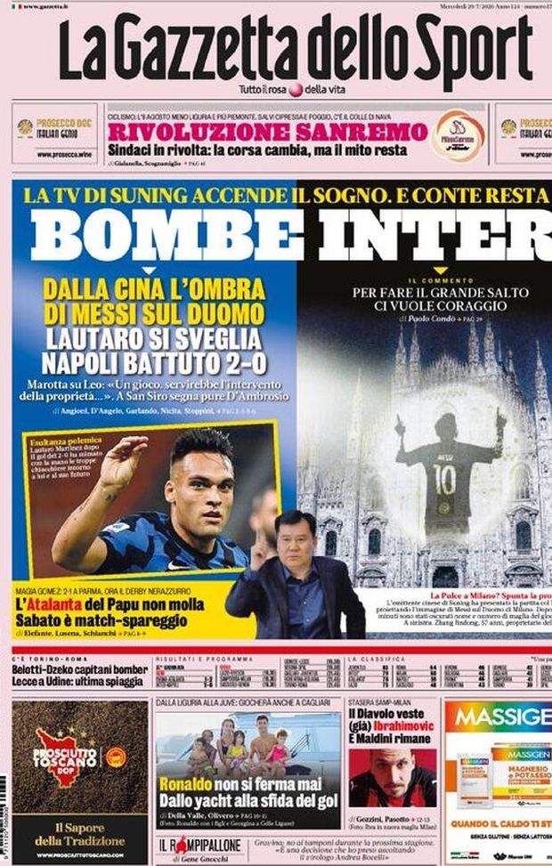 ULTIME NOTIZIE MILAN NEWS - Ecco le prime pagine di oggi, mercoledì 29 luglio 2020 de 'La Gazzetta dello Sport', 'Corriere dello Sport' e 'Tuttosport'. In primo piano la vittoria dell'Inter nel segno di Lautaro Martinez, che chiude il match con il Napoli con un gran gol. Nelle zone alte vittoria in rimonta dell'Atalanta per 2-1 sul campo del Parma.