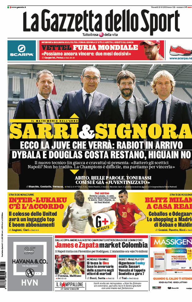ULTIME MILAN - Ecco le prime pagine di oggi venerdì 21 giugno 2019 de 'La Gazzetta dello Sport', 'Corriere dello Sport' e 'Tuttosport'. In primo piano la presentazione alla Juventus di Maurizio Sarri, che ha risposto a tutte le domande dei giornalisti presenti alla Continassa in conferenza stampa. In casa Milan, invece, spazio al calciomercato con il blitz a Madrid di Maldini e Boban: l'obiettivo numero sembra essere Ceballos, ma occhio anche a Odegaard. A tra poco per tutta la rassegna, ovviamente in chiave rossonera.