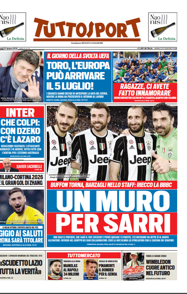 Milan sui media, le prime pagine dei giornali di oggi (27/06/2019)