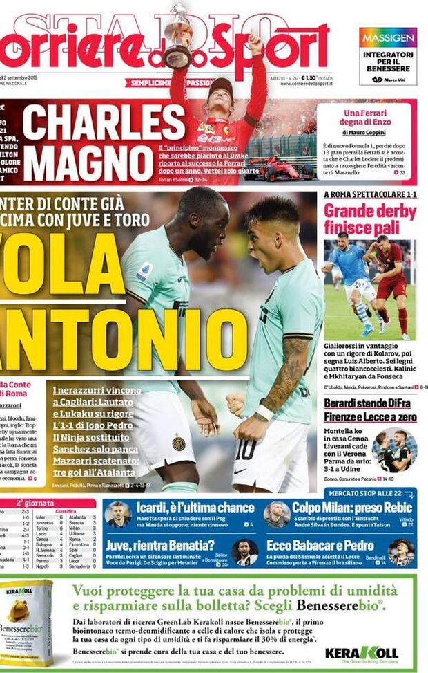 CALCIOMERCATO MILAN - Il 'Corriere dello Sport' oggi in edicola, sotto la testata, dedica spazio alla vittoria di Charles Leclerc, pilota francese della Ferrari, nel GP di Formula 1 di Spa, ma, nella sua parte centrale, celebra l'Inter di Antonio Conte, capace di espugnare per 2-1 il difficile campo del Cagliari: i nerazzurri, così come il Torino di Walter Mazzarri, sono a punteggio pieno in classifica, al pari della Juventus. Commenti, quindi, anche sul derby tra Lazio e Roma, terminato 1-1, nel festival dei pali e delle traverse, nonché sull'intera giornata di Serie A. Spazio, però, anche al mercato, che oggi vivrà la sua ultima giornata: Mauro Icardi va verso il PSG, il Milan ha preso Ante Rebic dall'Eintracht Francoforte in uno scambio con André Silva, la Juventus si prepara a riaccogliere il marocchino Mehdi Benatia in difesa mentre Lecce e Fiorentina aspettano i loro nuovi attaccanti: Babacar e Pedro.
