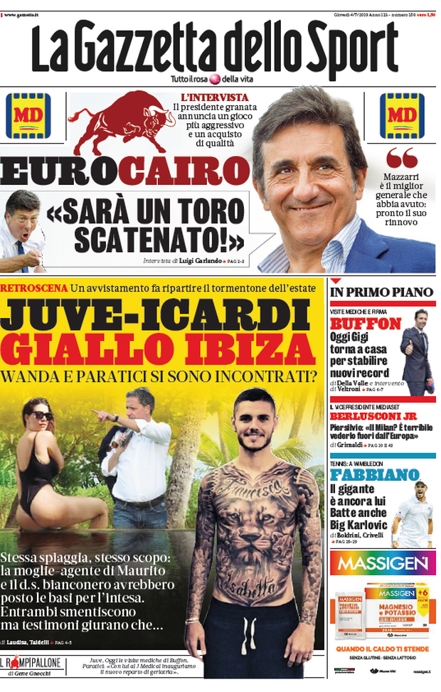 Ecco le prime pagine di oggi giovedì 4 luglio 2019 de 'La Gazzetta dello Sport', 'Corriere dello Sport' e 'Tuttosport'. In primo piano l'incontro a Ibiza tra Wanda Nara e Fabio Paratici, direttore sportivo della Juventus: Mauro Icardi andrà a giocare nel club bianconero? Sul fronte Milan, invece, da segnare le parole di Pier Silvio Berlusconi. Restate con noi per scoprire tutta la rassegna, ovviamente in chiave rossonera.