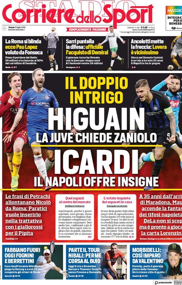 "CALCIOMERCATO MILAN - Il 'Corriere dello Sport' apre la sua edizione nazionale con Gonzalo Higuain e Mauro Icardi, bomber argentini al centro dei 'rumors' di calciomercato: il primo potrebbe andare alla Roma, con Nicolò Zaniolo a fare il percorso inverso, magari, in direzione Torino; il secondo, invece, potrebbe sposare il progetto del Napoli di Aurelio De Laurentiis che, per averlo, spedirebbe in nerazzurro Lorenzo Insigne. Nel taglio alto del quotidiano romano, tre news 'flash' di mercato: la Roma ha blindato la propria porta con Pau López del Betis; la Juventus ha prelevato per 18 milioni il difensore centrale turco Merih Demiral dal Sassuolo; il Napoli di Carlo Ancelotti aspetta, come nuovo rinforzo nella batteria di esterni offensivi, Maximiliano Lovera, 20 anni, argentino del Rosario Central.