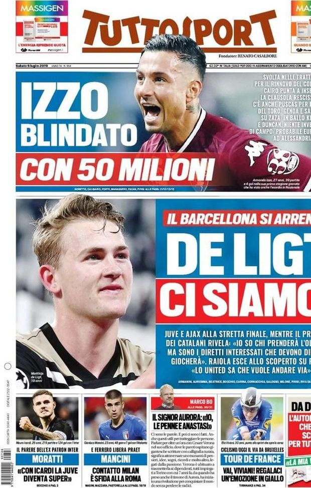 "CALCIOMERCATO MILAN - Infine, 'Tuttosport' apre la sua edizione nazionale con Armando Izzo, difensore centrale del Torino, in procinto di essere blindato dal suo Presidente, Urbano Cairo, con un rinnovo contrattuale che prevede una clausola rescissoria di 50 milioni euro. Quindi, spazio alla Juventus, ad un passo dal prendere Matthijs de Ligt dall'Ajax dopo la resa del Barcellona sul forte difensore olandese. In più, Mino Raiola, agente del centrale del club di Amsterdam, apre alla partenza di un altro suo assistito, Paul Pogba, che vuole lasciare il Manchester United. Nel taglio basso, intervista a Massimo Moratti, ex Presidente dell'Inter, che spera che Mauro Icardi non vada alla Juventus e si parla anche del mercato del Milan, con il contatto per Gianluca Mancini, difensore centrale dell'Atalanta, per il quale si sfida la Roma. Il tutto mentre Massimo Ferrero, Presidente della Sampdoria, apre ad una partenza di Dennis Praet verso Milano.