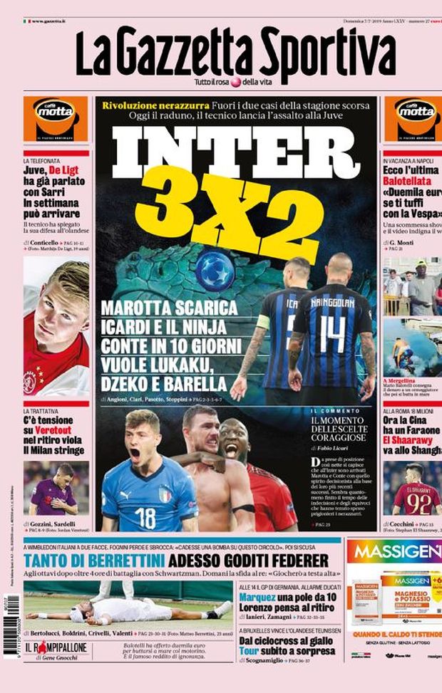 "CALCIOMERCATO MILAN - 'La Gazzetta dello Sport' in edicola questa mattina dedica la sua prima pagina all'Inter di Antonio Conte: scaricatiRadja Nainggolan e Mauro Icardi, ora i nerazzurri vogliono chiudere al più presto per Nicolò Barella, Edin Dzeko e Romelu Lukaku. Quindi, spazio alla Juventus, con il colloquio tra Matthijs de Ligt e Maurizio Sarri; al Milan, con i rossoneri che stringono i tempi per Jordan Veretout della Fiorentina; alla Roma, che ha praticamente ceduto Stephan El Shaarawy allo Shanghai Shenhua e, infine, all'ultima follia di Mario Balotelli, in vacanza a Napoli.