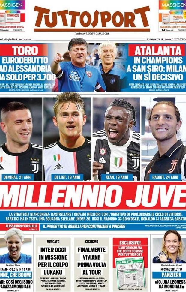 "CALCIOMERCATO MILAN - Infine, il quotidiano 'Tuttosport' dedica la sua prima pagina alla Juventus di Maurizio Sarri, che oggi inizierà ufficialmente la stagione 2019-2020: una rosa ritrovata e ringiovanita, quella bianconera, grazie agli acquisti di Merih Demiral, Matthijs de Ligt, Adrien Rabiot e la conferma di Moise Kean. Questa la strategia di Fabio Paratici, direttore sportivo della 'Vecchia Signora'. 33 i convocati per il raduno: Cristiano Ronaldo si aggregherà al gruppo nella giornata di sabato. Nel taglio alto, il Torino, che giocherà i preliminari di Europa League al 'Moccagatta' di Alessandria davanti a sole 3700 persone e l'Atalanta, che aspetta il 'sì', non scontato, dal Milan per disputare le proprie gare interne di Champions League a 'San Siro'. Nel taglio basso, invece, l'Inter, che oggi sarà in missione in Inghilterra per Romelu Lukaku.
