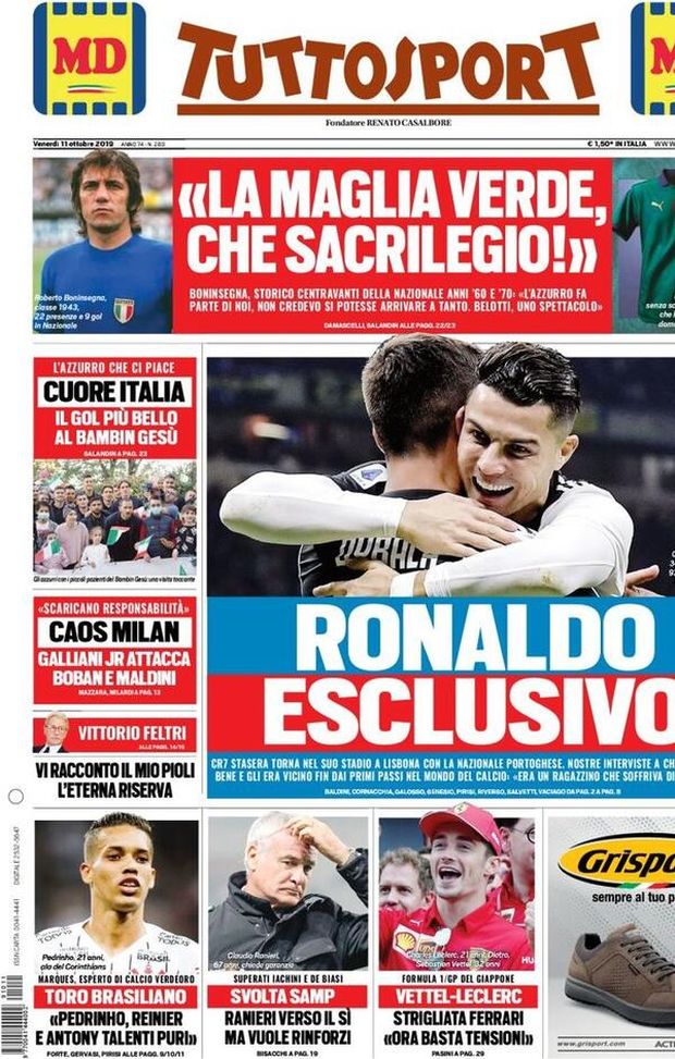 "ULTIME MILAN - Infine, anche 'Tuttosport' apre con Cristiano Ronaldo, stella della Juventus di Maurizio Sarri, dando, però, spazio alle parole di chi ha conosciuto l'asso portoghese sin da subito, dalla più tenera età. Nel taglio alto, sotto la testata, l'intervista a Roberto Boninsegna, a cui proprio non è andata giù la maglia verde, celebrativa, che l'Italia indosserà domani sera a Roma contro la Grecia. Nel riquadro verticale c'è spazio anche per il caos in casa Milan, con le accuse lanciate da Gianluca Galliani, figlio di Adriano, nei confronti della dirigenza rossonera. In basso, infine, intervista ad Andersinho Marques sui potenziali 'craque' di mercato in Brasile che interessano al Torino e la svolta in casa Sampdoria, con Claudio Ranieri verso il sì ai blucerchiati.