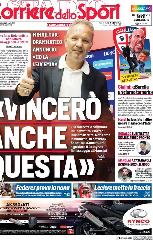 "CALCIOMERCATO MILAN - Occupa, invece, praticamente tutta la prima pagina del 'Corriere dello Sport' il dramma che sta vivendo Sinisa Mihajlovic, tecnico del Bologna, che ha annunciato di doversi fermare per combattere contro una leucemia acuta ed aggressiva. Spazio anche all'editoriale di Ivan Zazzaroni, direttore del quotidiano romano, 'accusato' ieri da Mihajlovic per avergli mancato di tatto e rispetto sulla questione. Nel riquadro verticale, l'intervista esclusiva con Tommaso Giulini, Presidente del Cagliari, che ha parlato anche di Nicolò Barella, ceduto all'Inter. A proposito dei nerazzurri: come noto, Mauro Icardi è stato escluso dalla tournée asiatica della squadra. Andrà al Napoli? Intanto, gli azzurri accolgono Kostas Manolas e trattano con Lorenzo Insigne il rinnovo di contratto fino al 30 giugno 2024.
