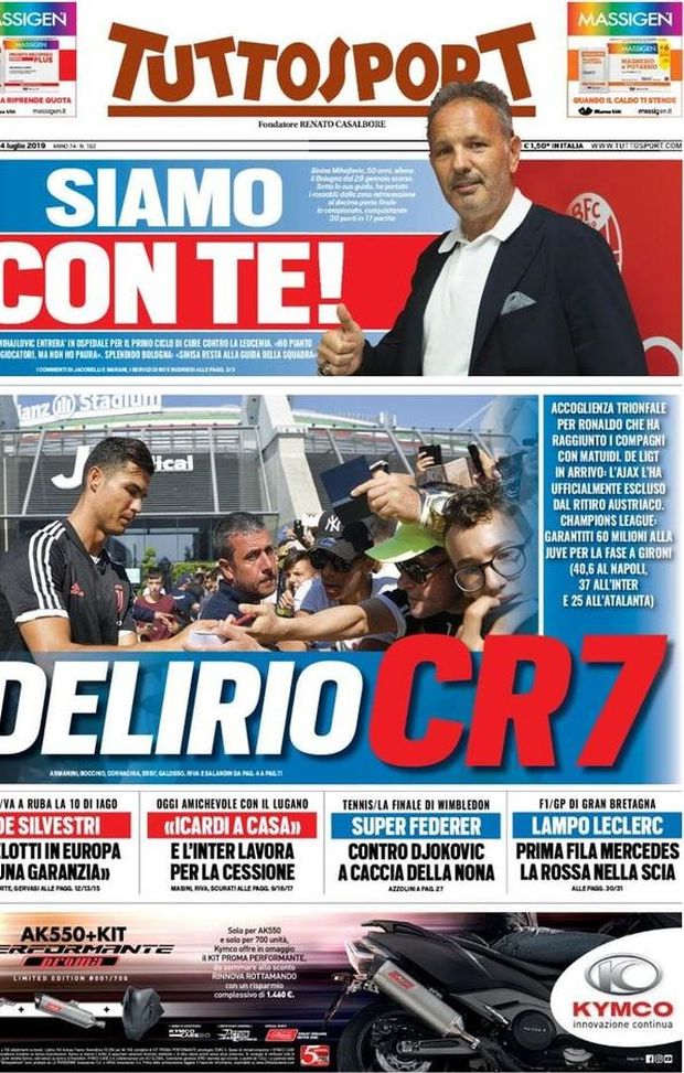 "CALCIOMERCATO MILAN - Infine, 'Tuttosport' dedica la sua prima pagina al ritorno di Cristiano Ronaldo alla Continassa per riprendere gli allenamenti con la Juventus, questa volta agli ordini del nuovo tecnico, Maurizio Sarri. Tutto pronto per accogliere lo sbarco a Torino di Matthijs de Ligt, che non è partito per il ritiro austriaco con l'Ajax. Nel taglio alto del quotidiano torinese, però, c'è spazio anche per la vicenda che ha travolto Sinisa Mihajlovic, allenatore serbo del Bologna, costretto ad uno stop forzato: ora, l'avversario da battere è la leucemia. Nel taglio basso, si parla ancora della questione Mauro Icardi, lasciato ad allenarsi da solo a Milano e non convocato, quindi, per l'International Champions Cup in Asia. Infine, intervista a Lorenzo De Silvestri, terzino del Torino, che loda il compagno di squadra, Andrea 'Gallo' Belotti.