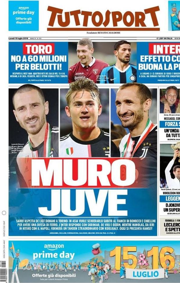 "CALCIOMERCATO MILAN - Infine, 'Tuttosport' dedica la sua copertina odierna al 'muro' della Juventus, costituito da Leonardo Bonucci, Giorgio Chiellini e Matthijs de Ligt, messo in contrapposizione con le difese di Inter e Napoli, principali rivali accreditate per la lotta allo Scudetto. Nel taglio alto del quotidiano torinese, la rivelazione di mercato: Urbano Cairo, Presidente del Torino, avrebbe rifiutato 60 milioni di euro dal West Ham per Andrea Belotti. In casa Inter, intanto, già si nota l'effetto Antonio Conte: 2-1 al Lugano nella prima uscita stagionale, gran gol per l'ex Sassuolo, Stefano Sensi.
