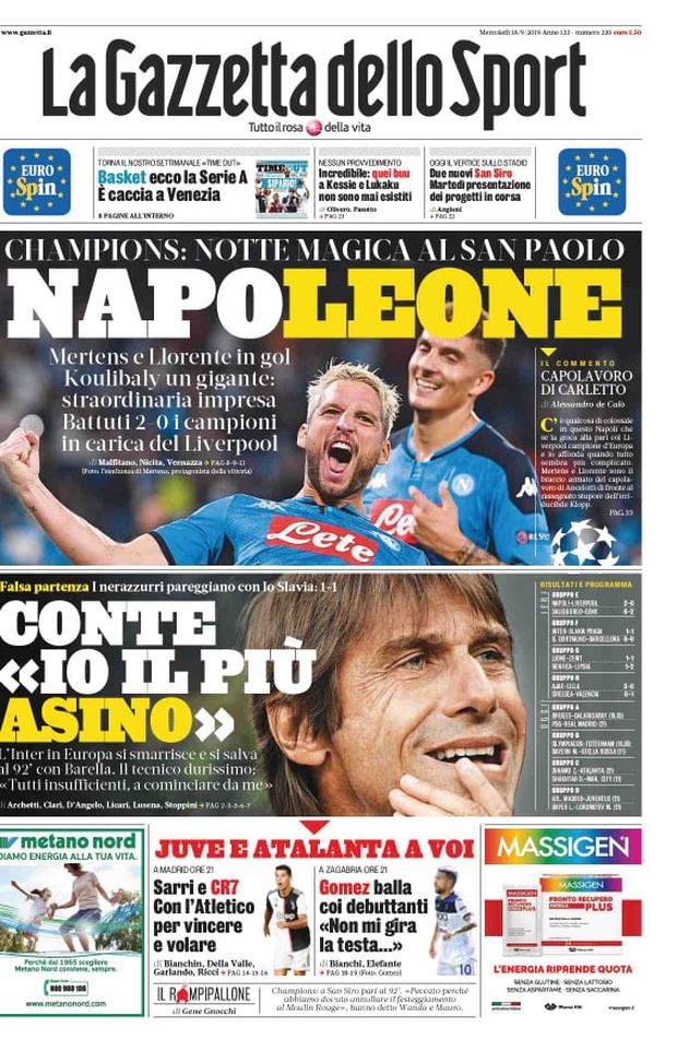 Ecco le prime pagine di oggi, mercoledì 18 settembre 2019 de 'La Gazzetta dello Sport', 'Corriere dello Sport' e 'Tuttosport'. In primo piano la Champions League, con lo strepitoso Napoli di Carlo Ancelotti che batte i campioni d'Europa in carica del Liverpool. Passo falso invece dell'Inter, che pareggia 1-1 in casa contro lo Slavia Praga. A tra poco per la rassegna stampa completa.