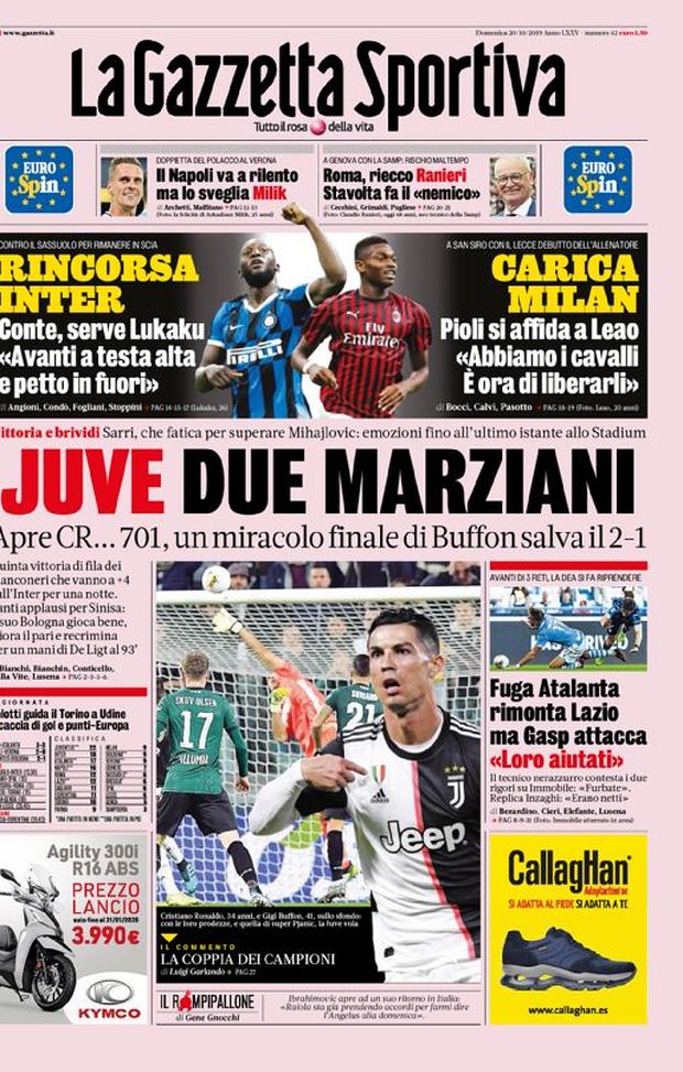 "ULTIME MILAN - 'La Gazzetta dello Sport' in edicola questa mattina dedica la sua prima pagina a Cristiano Ronaldo ed a Gianluigi Buffon, 'i due marziani' artefici, rispettivamente con un gol ed un miracolo in pieno recupero, della vittoria per 2-1 della Juventus di Maurizio Sarri sul Bologna di Sinisa Mihajlovic. Nel taglio alto, sotto la testata, spazio invece all'Inter, impegnata oggi alle ore 12:30 sul campo del Sassuolo, ed al Milan, con Stefano Pioli che debutta alle ore 20:45 sulla panchina rossonera ospitando il Lecce. Nel riquadro verticale, in basso, la furia di Gian Piero Gasperini al termine di Lazio-Atalanta 3-3: il tecnico della 'Dea', infatti, non ha mandato giù la tripla rimonta biancoceleste con due calci di rigore ...