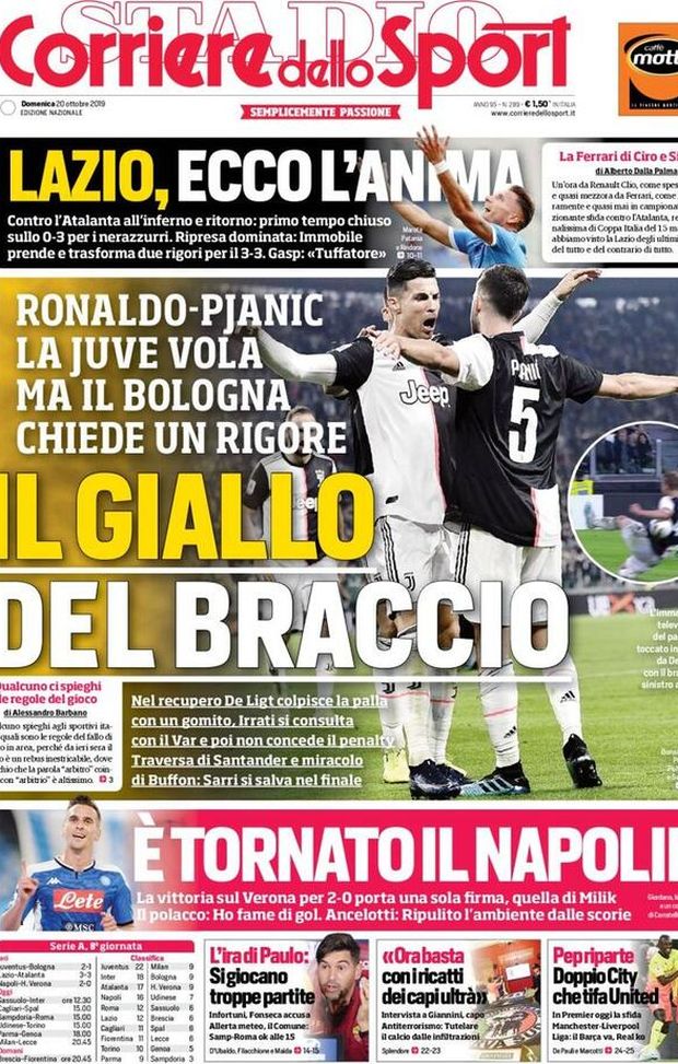 "ULTIME MILAN - Il 'Corriere dello Sport', invece, parlando di Juventus-Bologna 2-1 evidenzia i gol di Cristiano Ronaldo e Miralem Pjanic, ma, soprattutto, il fallo di mano in area bianconera del difensore juventino Matthijs de Ligt che avrebbe potuto portare al calcio di rigore per i rossoblu nel recupero del match. L'arbitro Massimiliano Irrati, però, non è stato dello stesso avviso. In alto, sotto la testata, la rimonta della Lazio, da 0-3 a 3-3, contro l'Atalanta e la furia di Gian Piero Gasperini contro Ciro Immobile, autore di una doppietta su calcio di rigore: "È un tuffatore". In basso, invece, il commento alla doppietta di Arkadiusz Milik, decisiva in Napoli-Verona 2-0. Oggi, alle ore 15:00, si disputa a 'Marassi' Sampdoria-Roma ed il tecnico giallorosso, Paulo Fonseca, sbotta: "Si giocano troppe partite".
