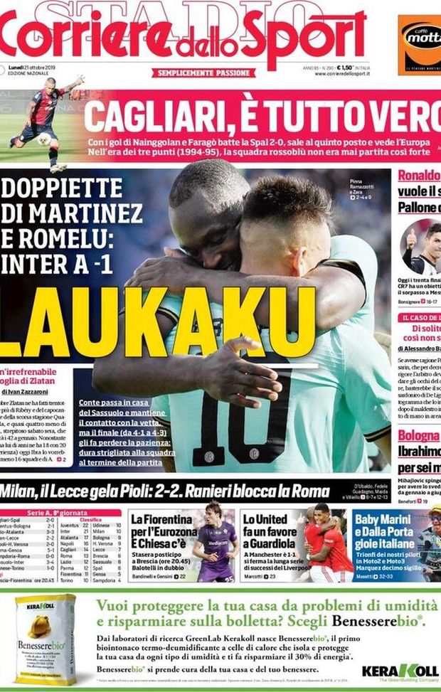 "ULTIME MILAN - Anche il 'Corriere dello Sport' apre con la coppia d'oro dell'Inter, quella composta da Lautaro Martínez e Romelu Lukaku, autori dei 4 gol con cui i nerazzurri sono passati (con enormi difficoltà) sul terreno del Sassuolo. A fine partita, dura strigliata di Antonio Conte alla sua squadra negli spogliatoi del 'Mapei Stadium'. In alto, sotto la testata, si parla del Cagliari di Rolando Maran, vittorioso 2-0 sulla Spal (che gol di Radja Nainggolan!) ed in piena zona Europa League. Si parla, poi, del 2-2 di 'San Siro' tra Milan e Lecce, della caccia di Cristiano Ronaldo al sesto Pallone d'Oro e della pazza idea di Sinisa Mihajlovic: vorrebbe Zlatan Ibrahimovic al Bologna da gennaio a giugno 2020! Stasera, ore 20:45, c'è Brescia-Fiorentina che conclude l'8° turno di Serie A.