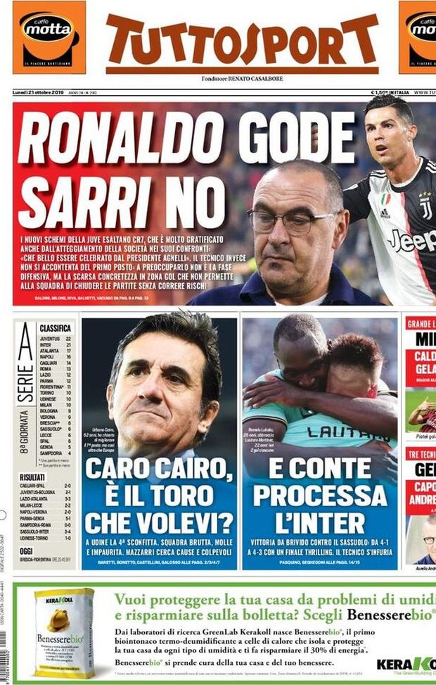 "ULTIME MILAN - Infine, l'edizione odierna di 'Tuttosport' si apre parlando degli animi contrastanti, in casa Juventus, tra Cristiano Ronaldo, esaltato dai nuovi schemi offensivi della 'Vecchia Signora', e Maurizio Sarri, tecnico bianconero, preoccupato, al contrario, dalla scarsa incisività della sua squadra in zona-gol. Nella parte centrale della prima pagina, poi, il processo al Torino di Urbano Cairo, sconfitto per 0-1 alla 'Dacia Arena' dall'Udinese, in gol con Stefano Okaka, e troppo brutto per essere vero. Anche il quotidiano torinese, poi, richiama l'attenzione sulla sfuriata di Antonio Conte al termine di Sassuolo-Inter 3-4. Nel riquadro verticale, il commento al pareggio del Lecce sul terreno del Milan, in virtù di un gran gol di Marco Calderoni al 92' a 'San Siro', ed al sempre più probabile esonero di Aurelio Andreazzoli dalla panchina del Genoa.