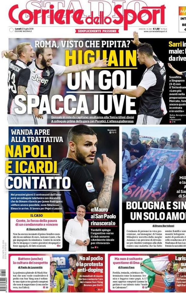 CALCIOMERCATO MILAN - Il 'Corriere dello Sport' oggi in edicola dedica ampio spazio, nel taglio della sua prima pagina, alla rete con cui Gonzalo Higuaín, ieri, in amichevole, ha lanciato un segnale contro il Tottenham. La Roma, interessata al centravanti della Juventus, ha osservato ammirata. Difesa da rivedere, intanto, per i bianconeri di Maurizio Sarri, sconfitti per 3-2 dagli 'Spurs' nel finale. Contatto, quindi, tra Wanda Nara ed il Napoli per il possibile trasferimento di Mauro Icardi alla corte di Carlo Ancelotti. Marco Tardelli, ex centrocampista di Juventus e Inter, lo 'spinge' in azzurro in un'intervista rilasciata al quotidiano romano. Spazio, quindi, all'amore che i tifosi del Bologna stanno dedicando al loro tecnico, Sinisa Mihajlovic, malato di leucemia ed in lotta contro la malattia.